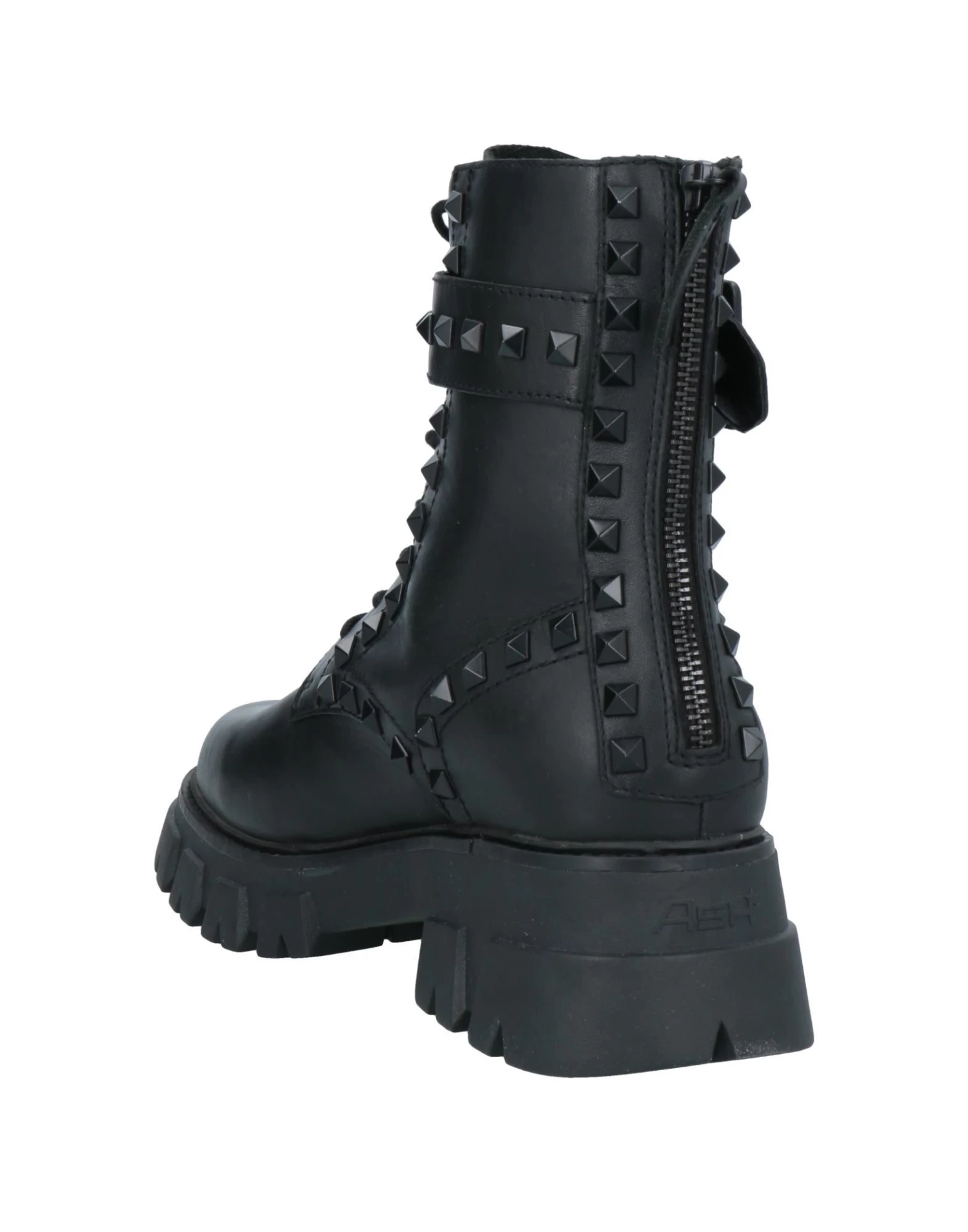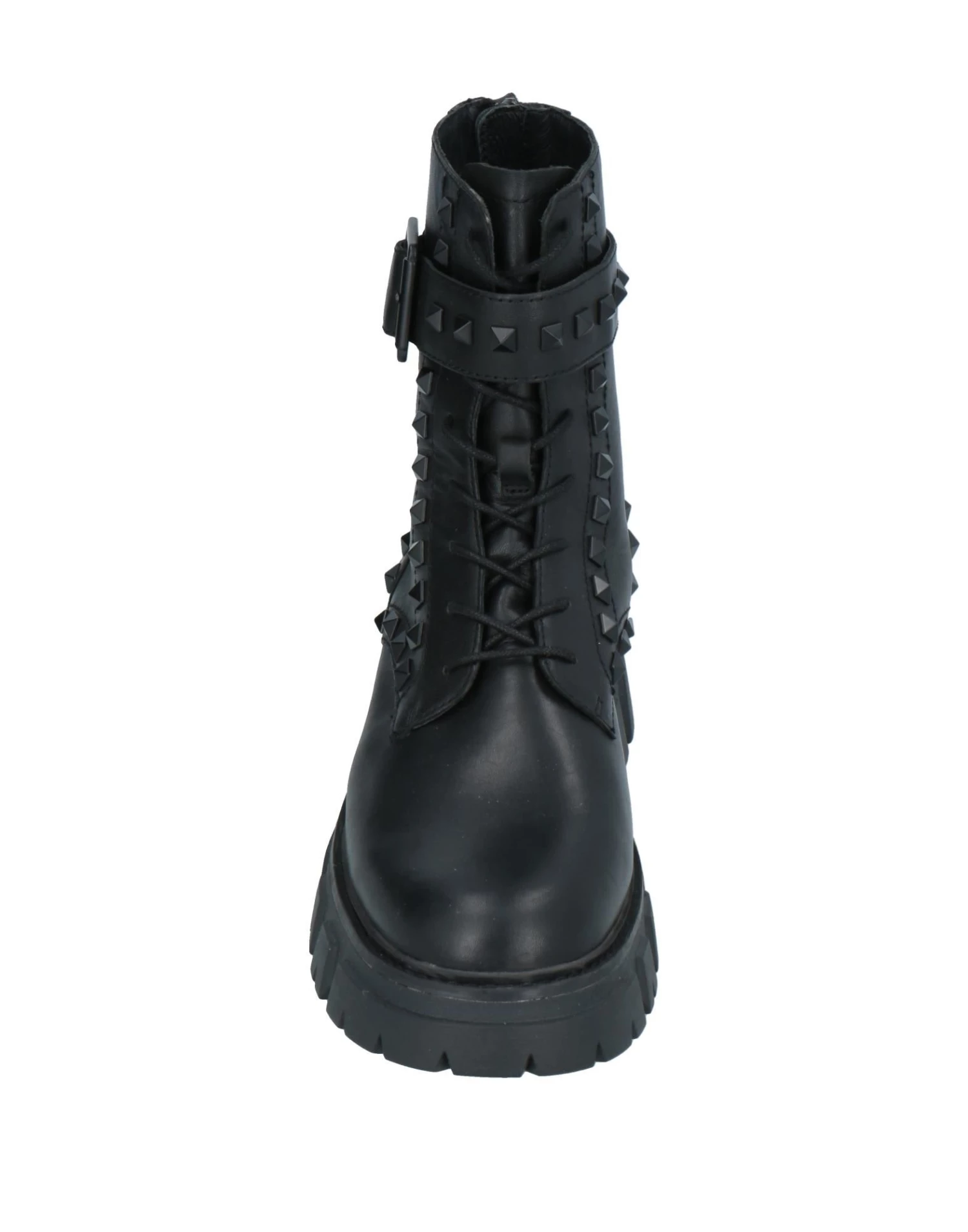 leather, strap detailing, studs, solid color, leather backing, zipper closure, laces, round toeline, square heel, rubber cleated sole, contains non-textile parts of animal origin