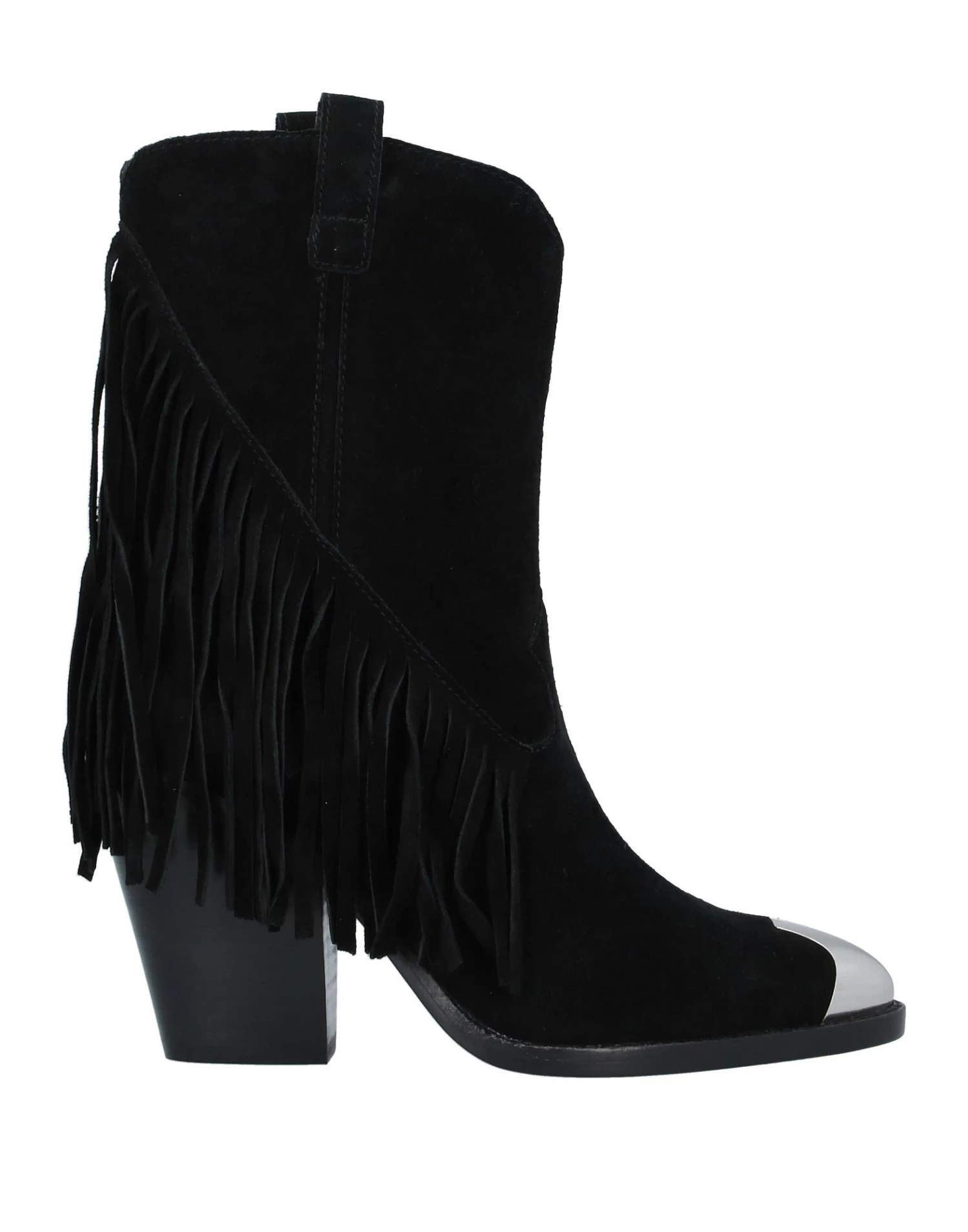 suede effect, metal applications, fringed trims, solid color, narrow toeline, cuban heel, leather lining, leather sole, contains non-textile parts of animal origin