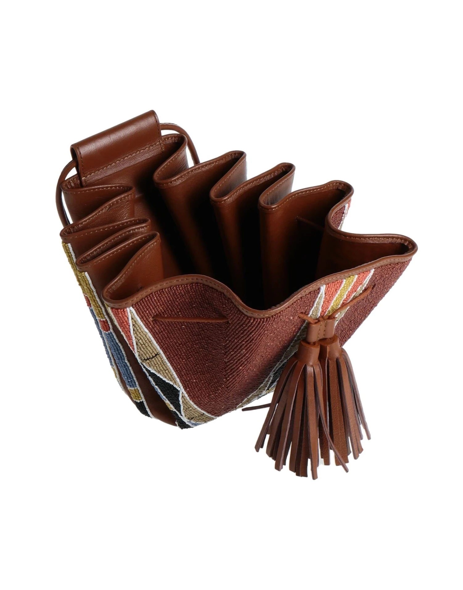small, leather, beads, tassels, ethnic design, leather backing, drawstring closure, adjustable shoulder strap, daytime, contains non-textile parts of animal origin