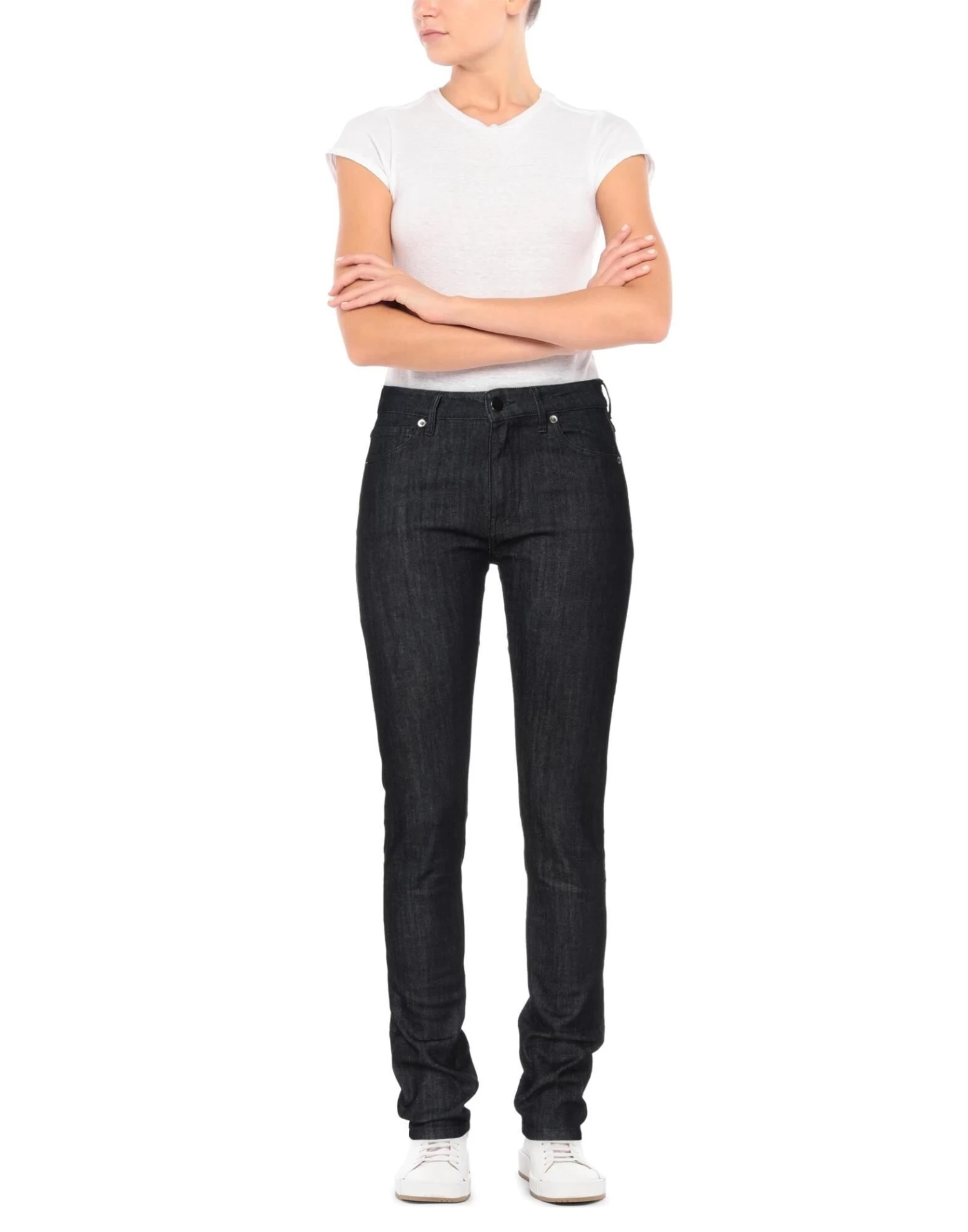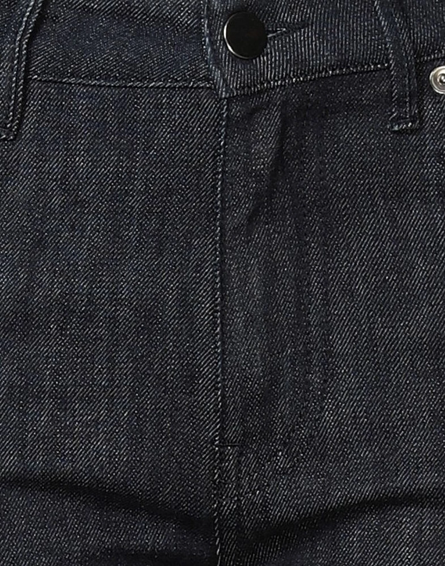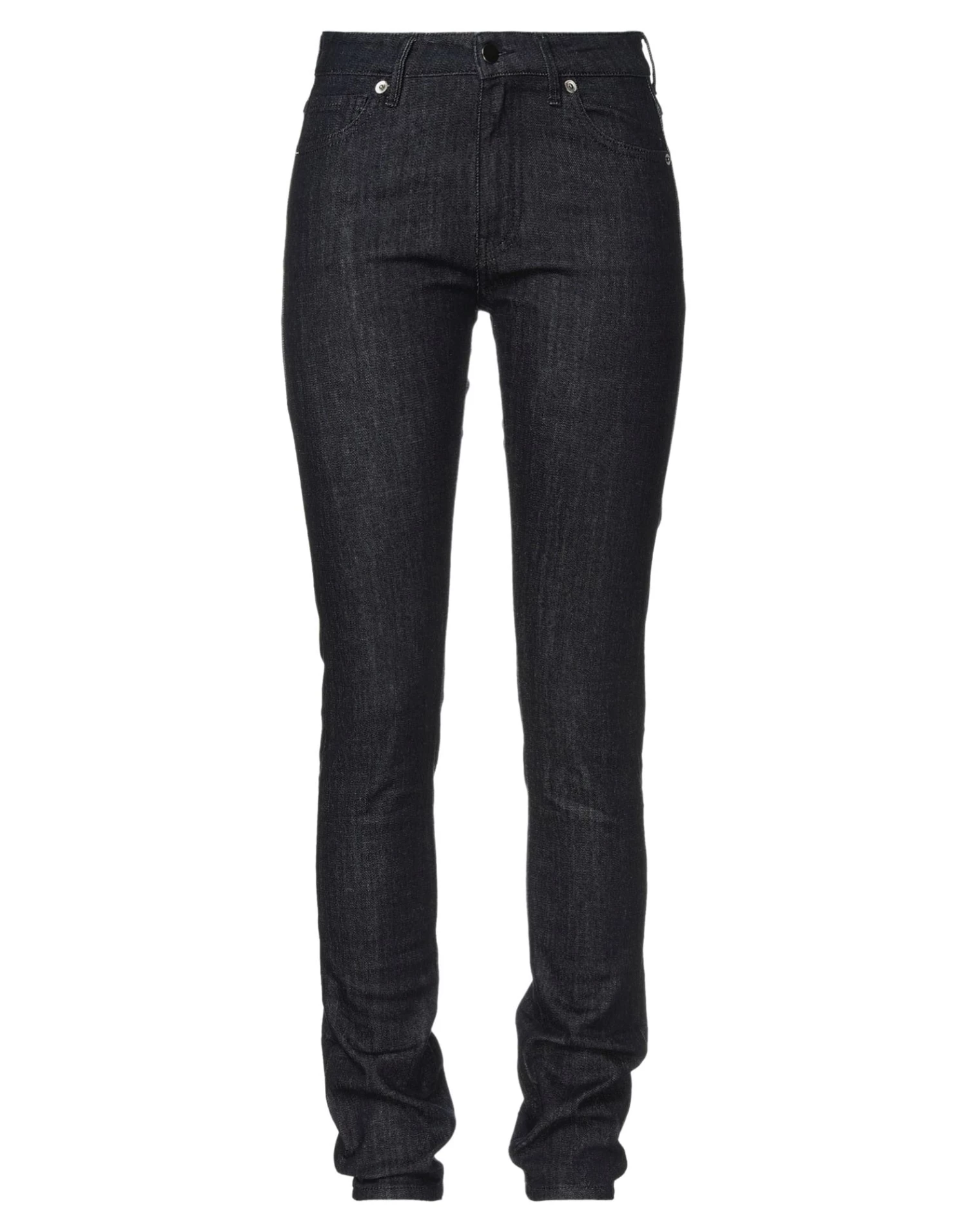 denim, brand logo, solid color, mid rise, tapered leg, slim-leg pants, zipper closure, 1 button, five pockets, stretch, dark wash