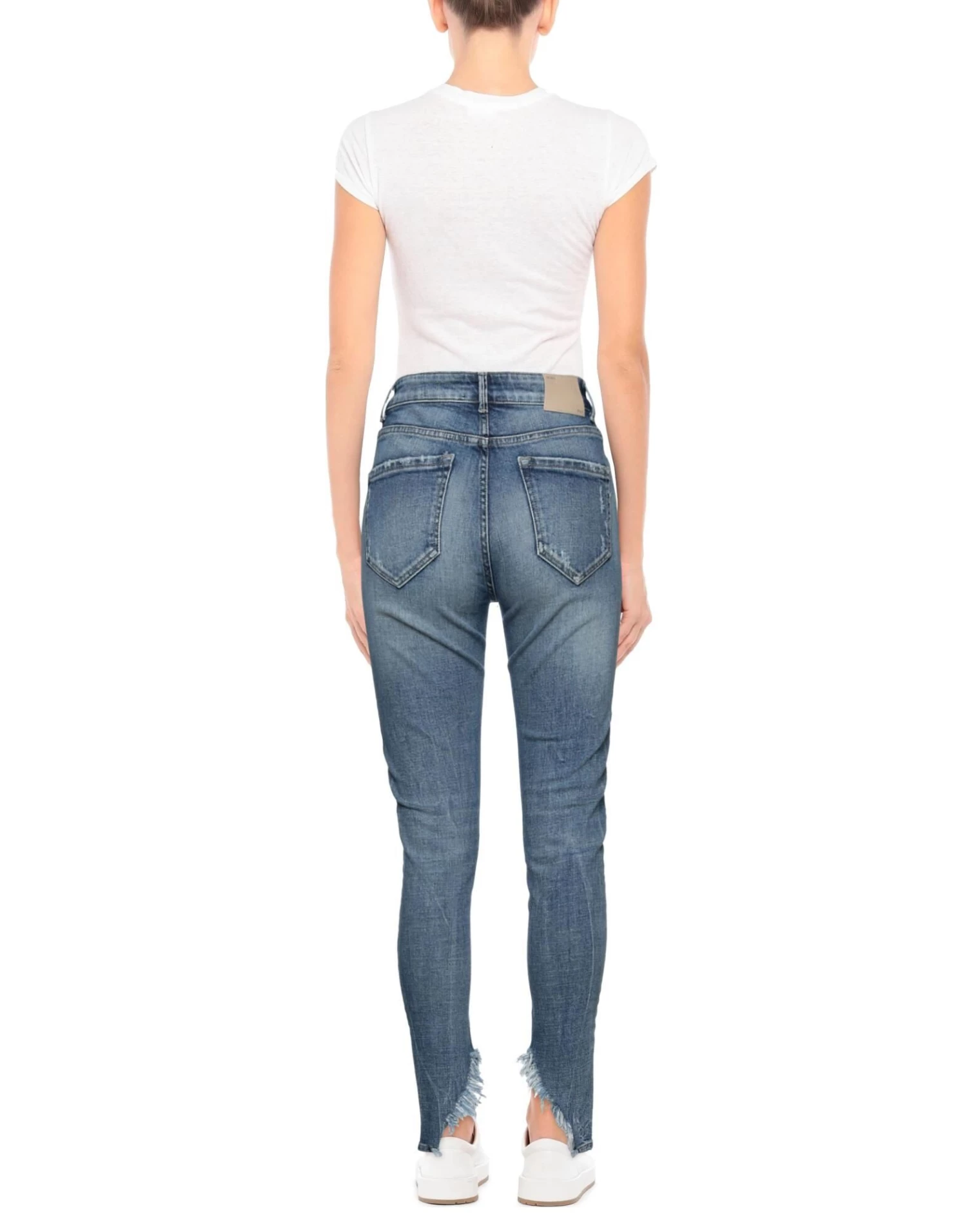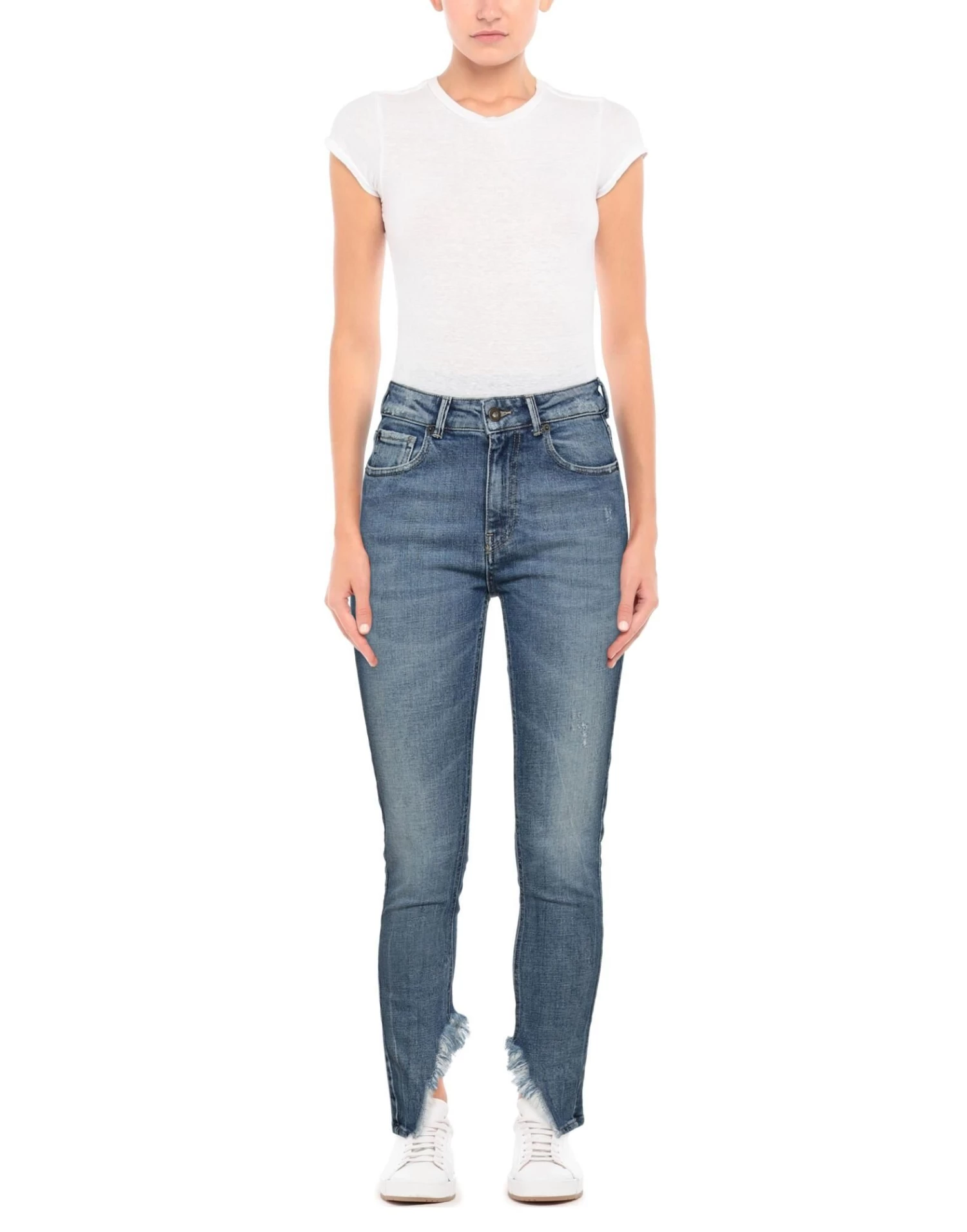 denim, faded, worn effect, brand logo, solid color, medium wash, mid rise, belt loops, tapered leg, slim-leg pants, 1 button, zipper closure, five pockets, asymmetrical hemline, stretch