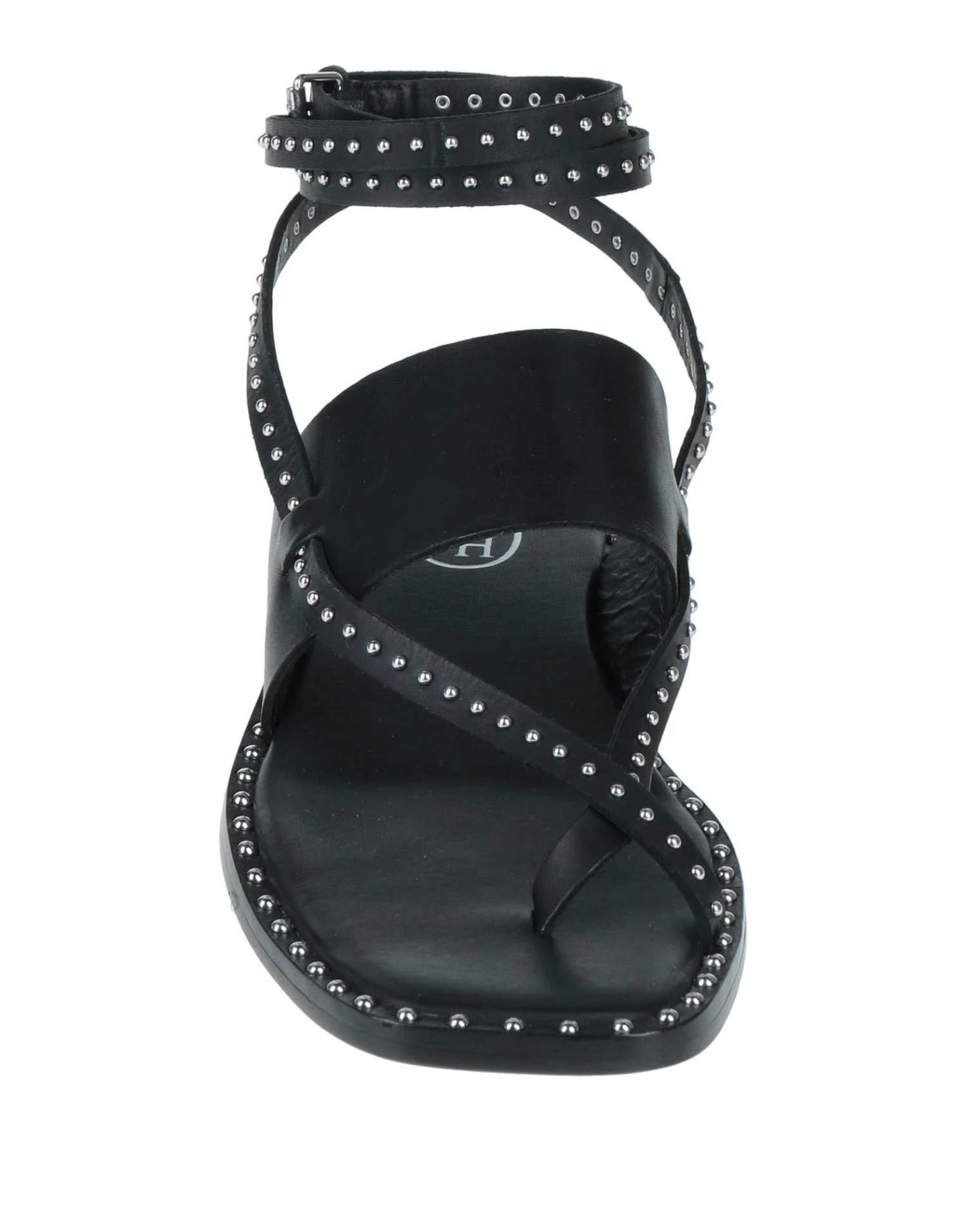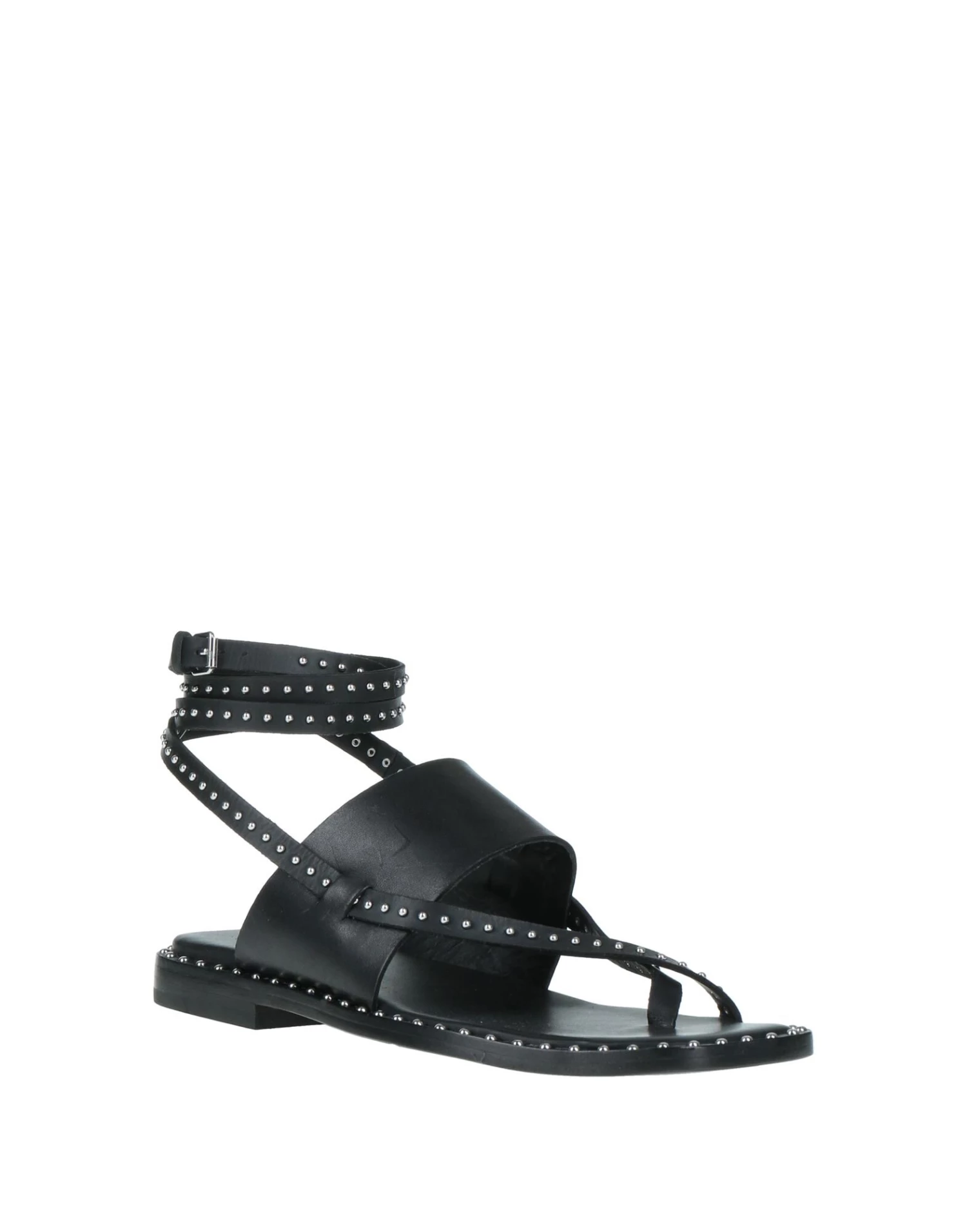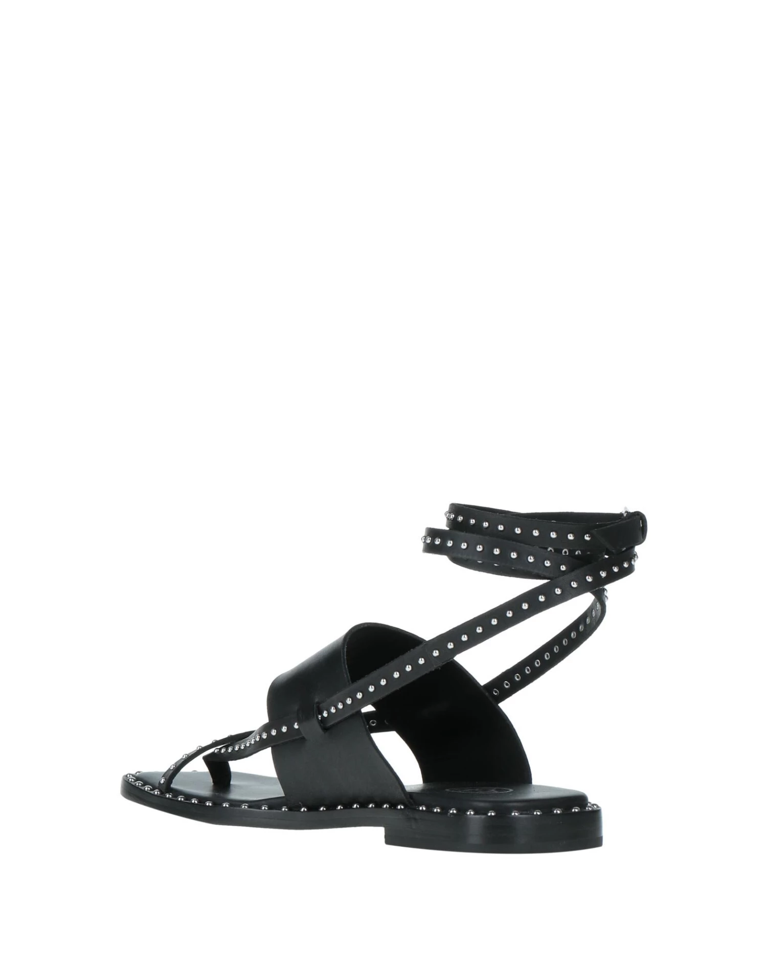 metal applications, solid colour with appliqués, leather backing, wrapping straps closure, square toeline, flat, rubber sole, contains non-textile parts of animal origin