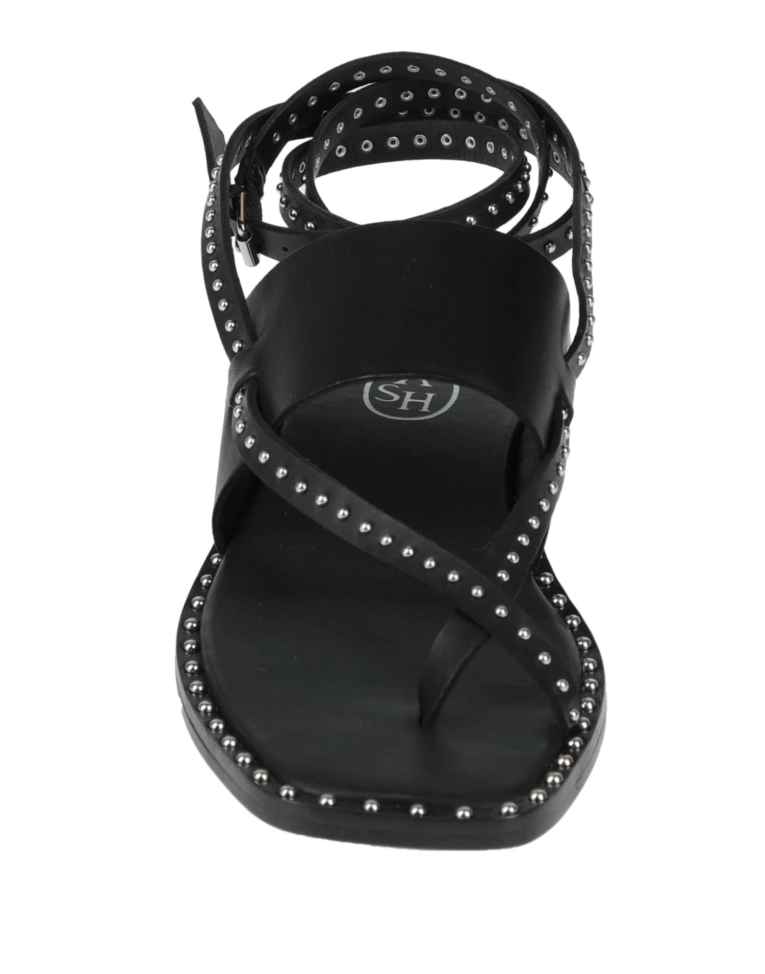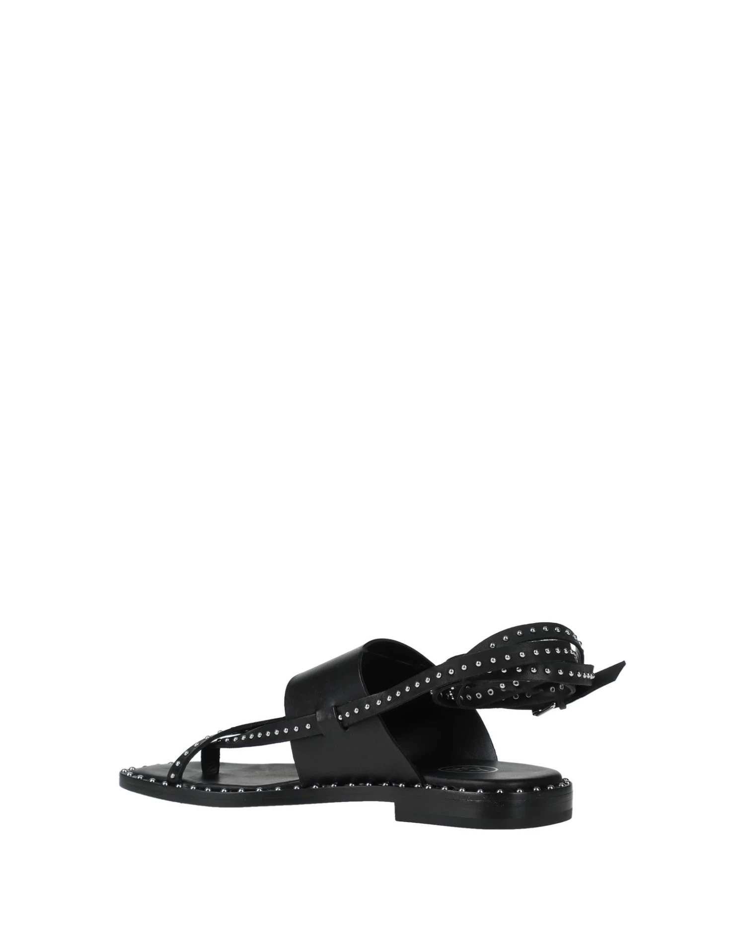 studs, solid colour with appliqués, buckle fastening, square toeline, flat, leather lining, leather/rubber sole, contains non-textile parts of animal origin