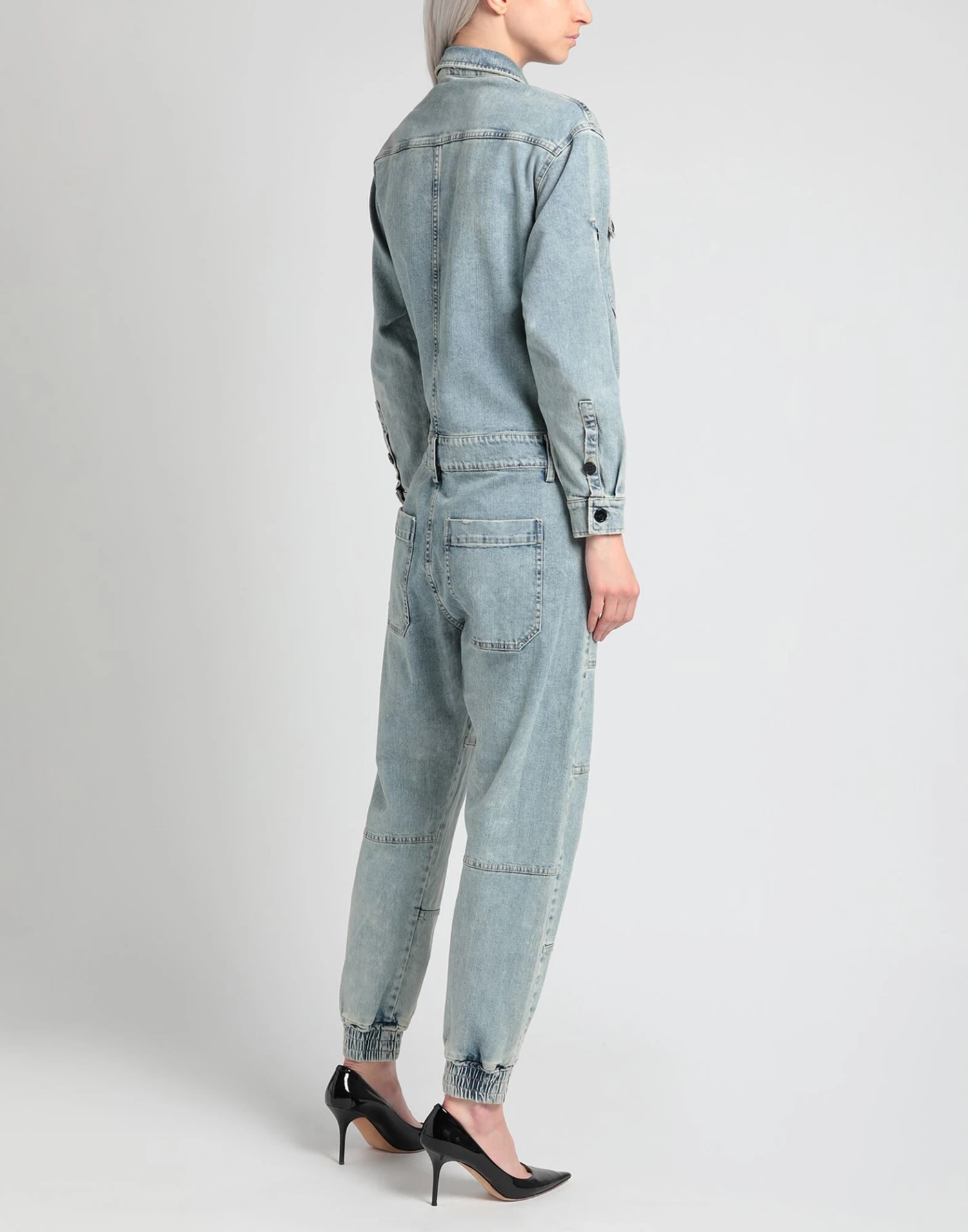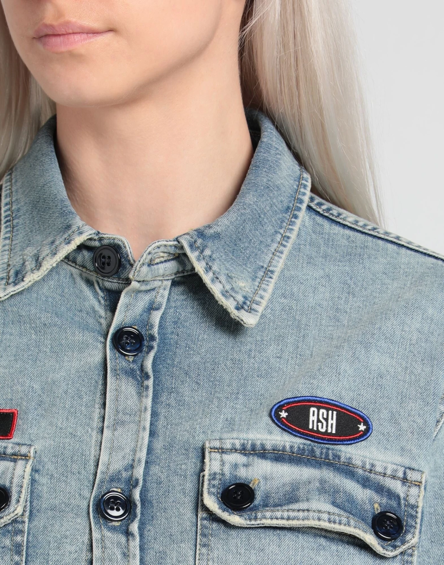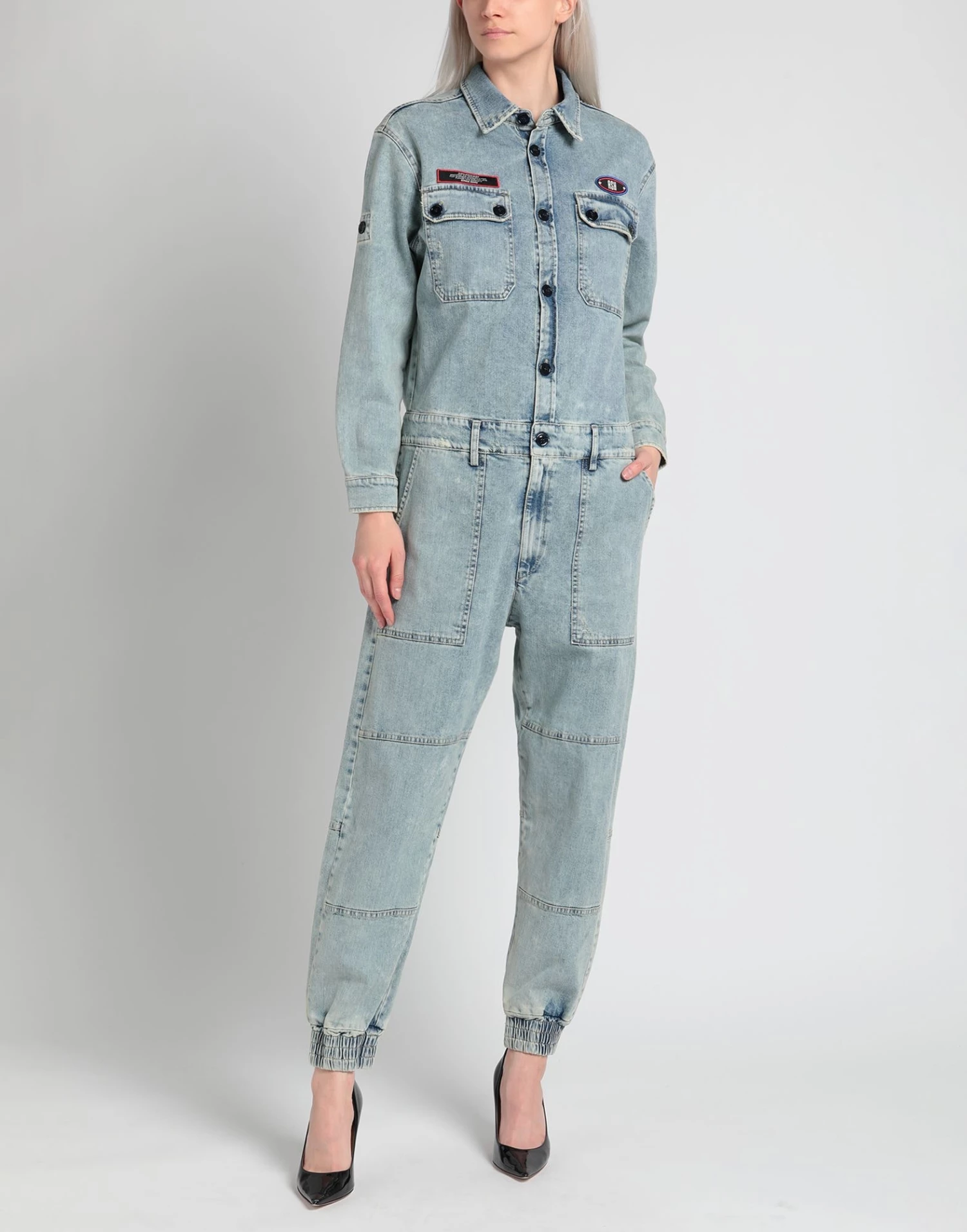denim, faded, brand logo, solid color, classic neckline, long sleeves, zipper closure, button closing, multipockets, stretch