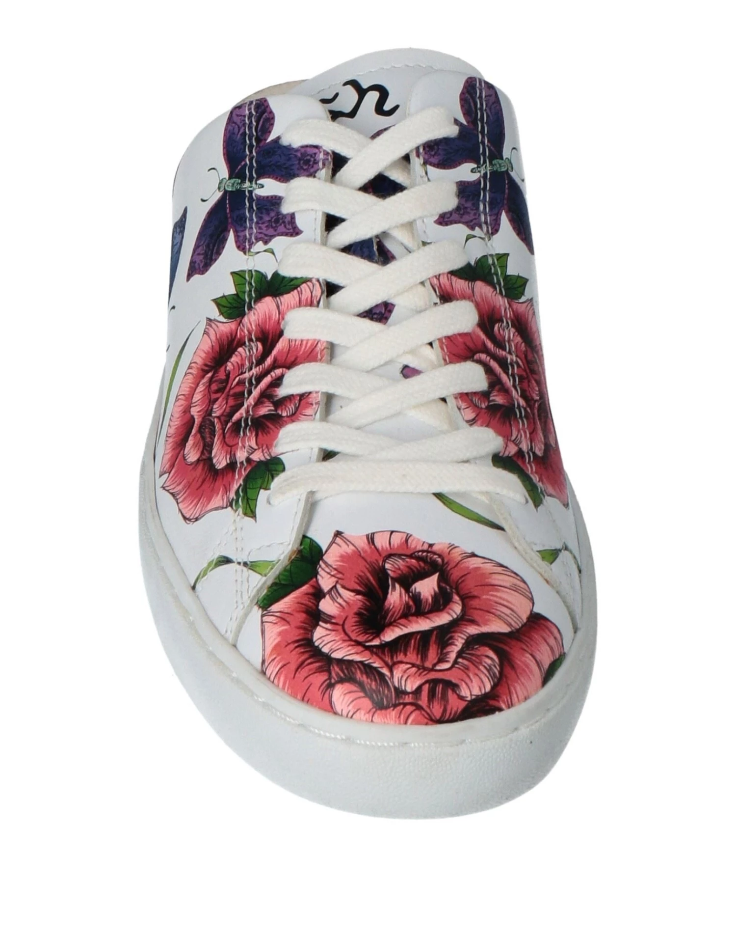 leather, brand logo, floral design, leather backing, laces, round toeline, flat, rubber sole, contains non-textile parts of animal origin