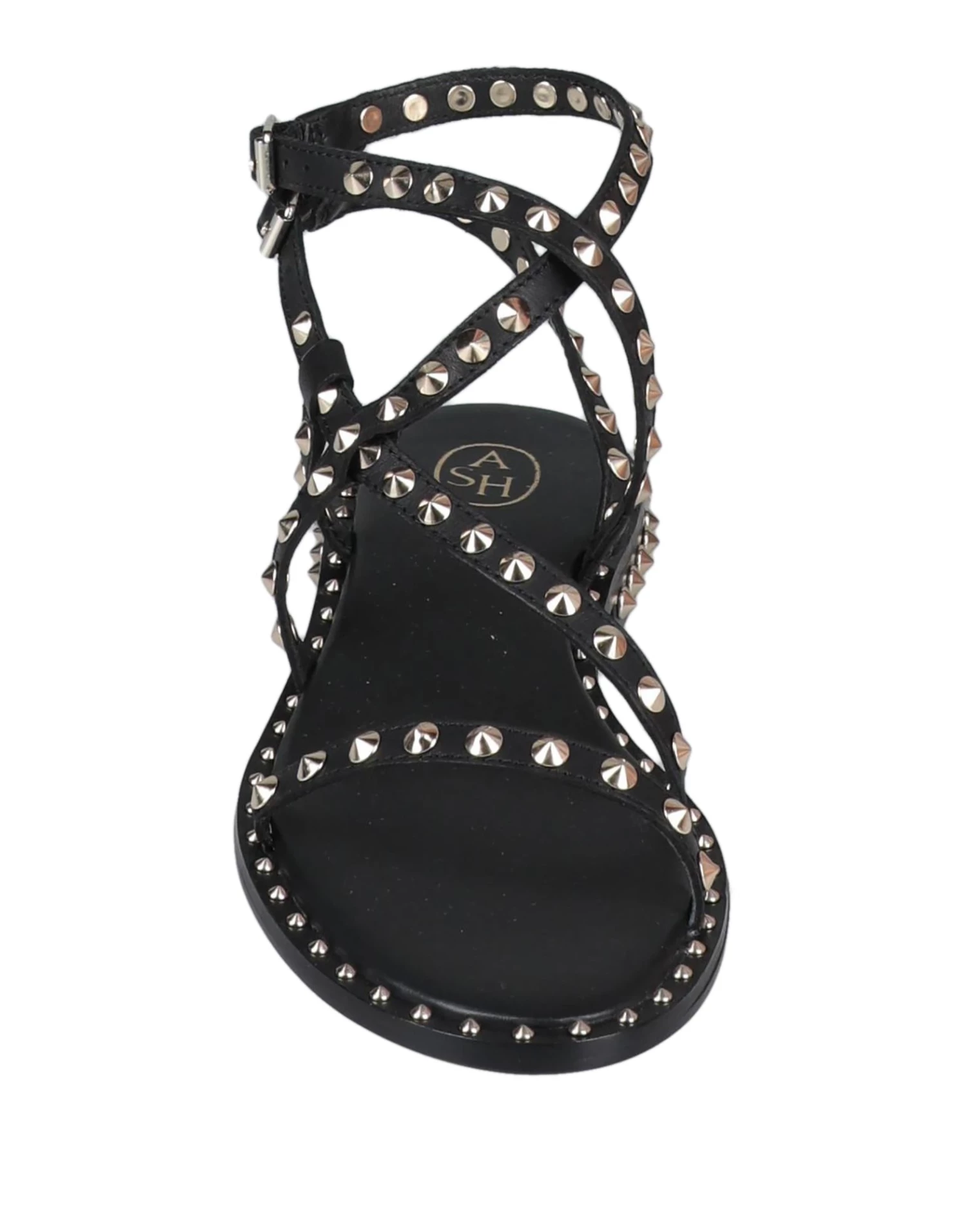 leather, studs, solid color, buckle fastening, round toeline, flat, leather lining, leather sole, contains non-textile parts of animal origin