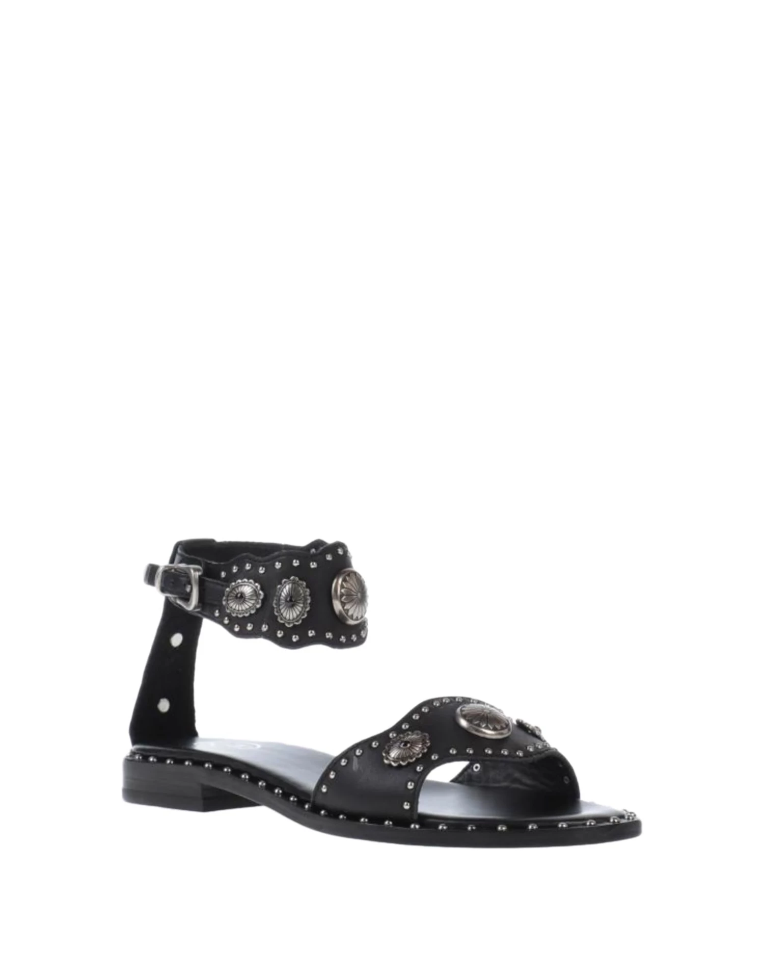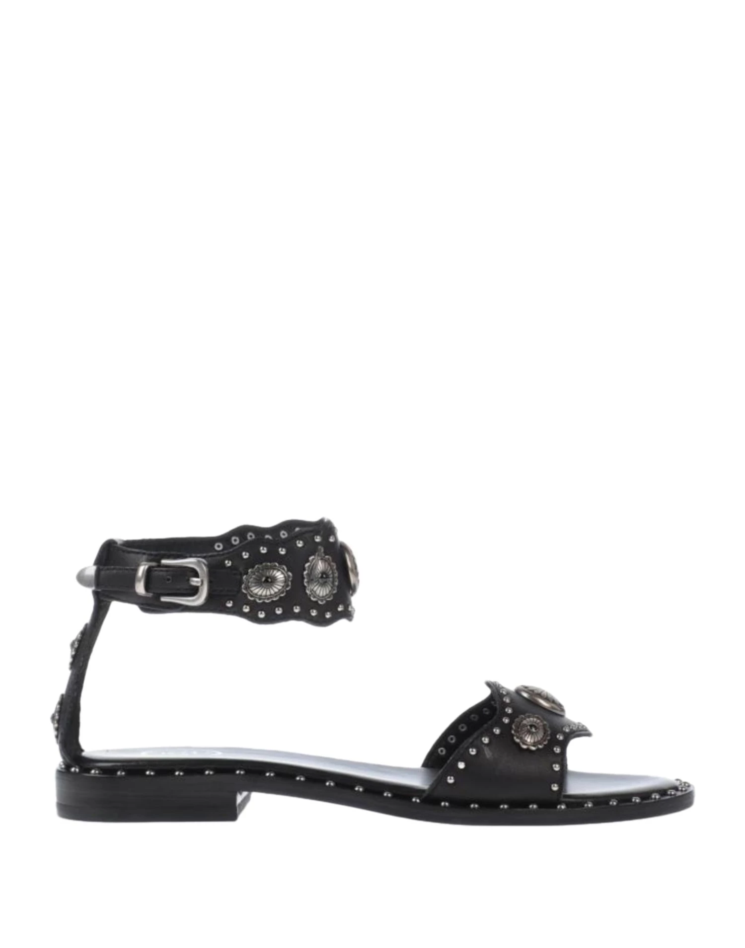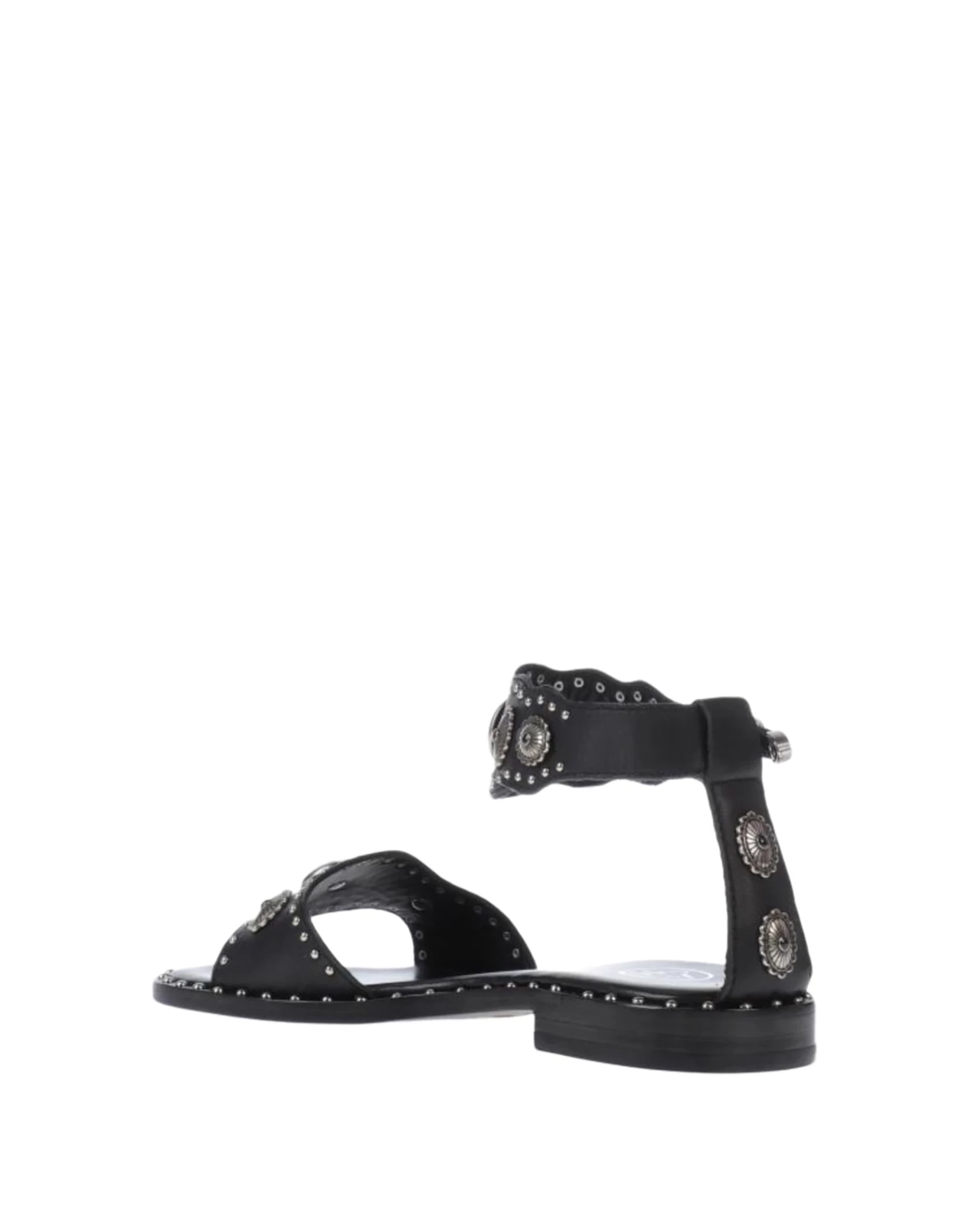 studs, metal applications, solid color, buckling ankle strap closure, round toeline, flat, leather lining, leather sole, contains non-textile parts of animal origin