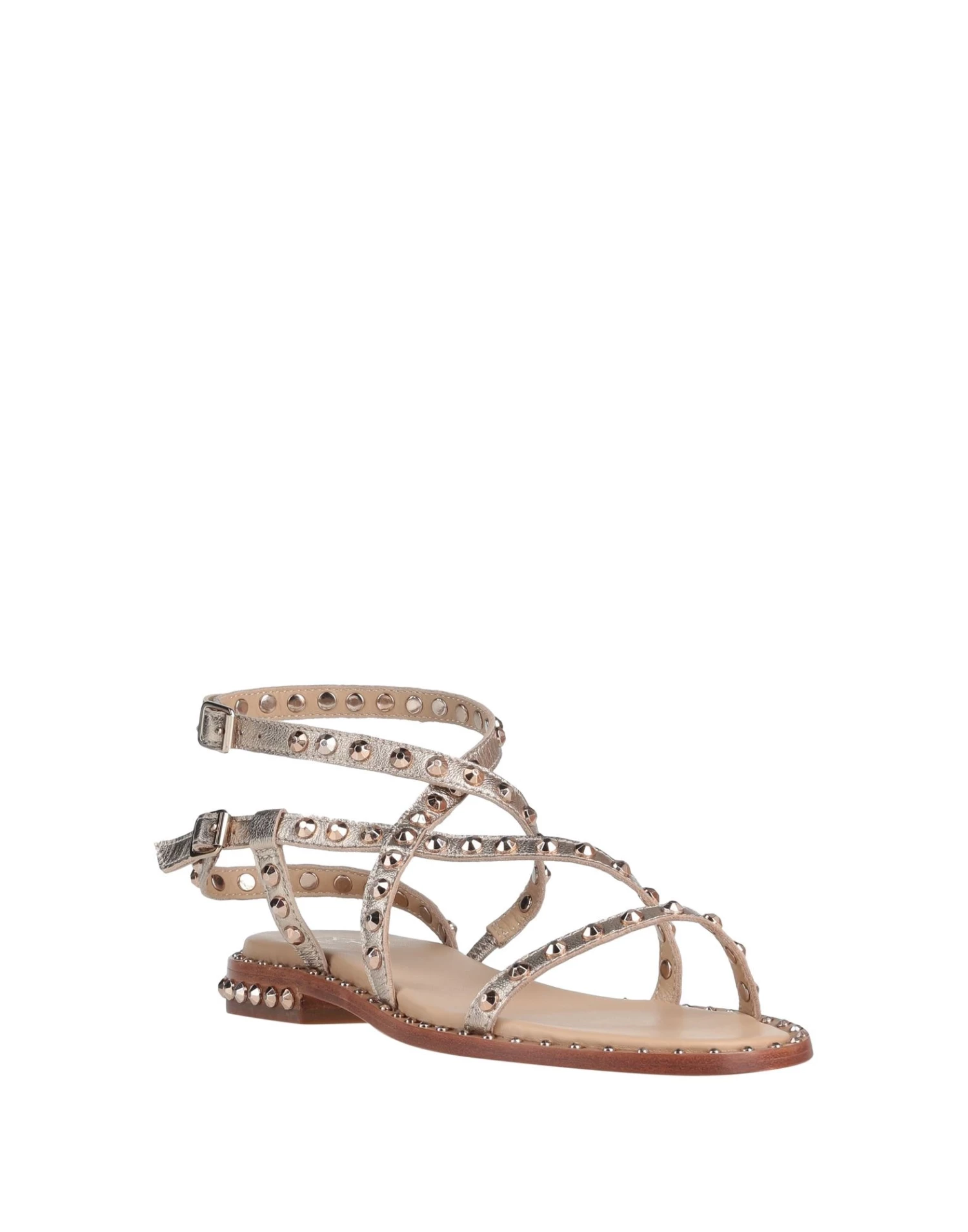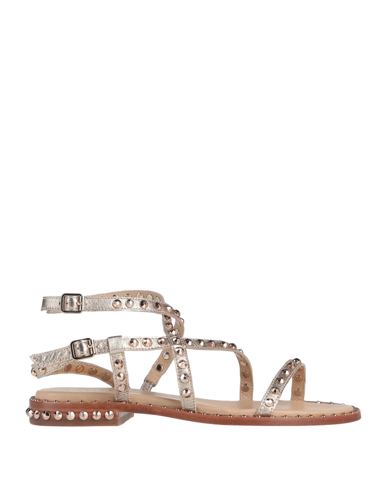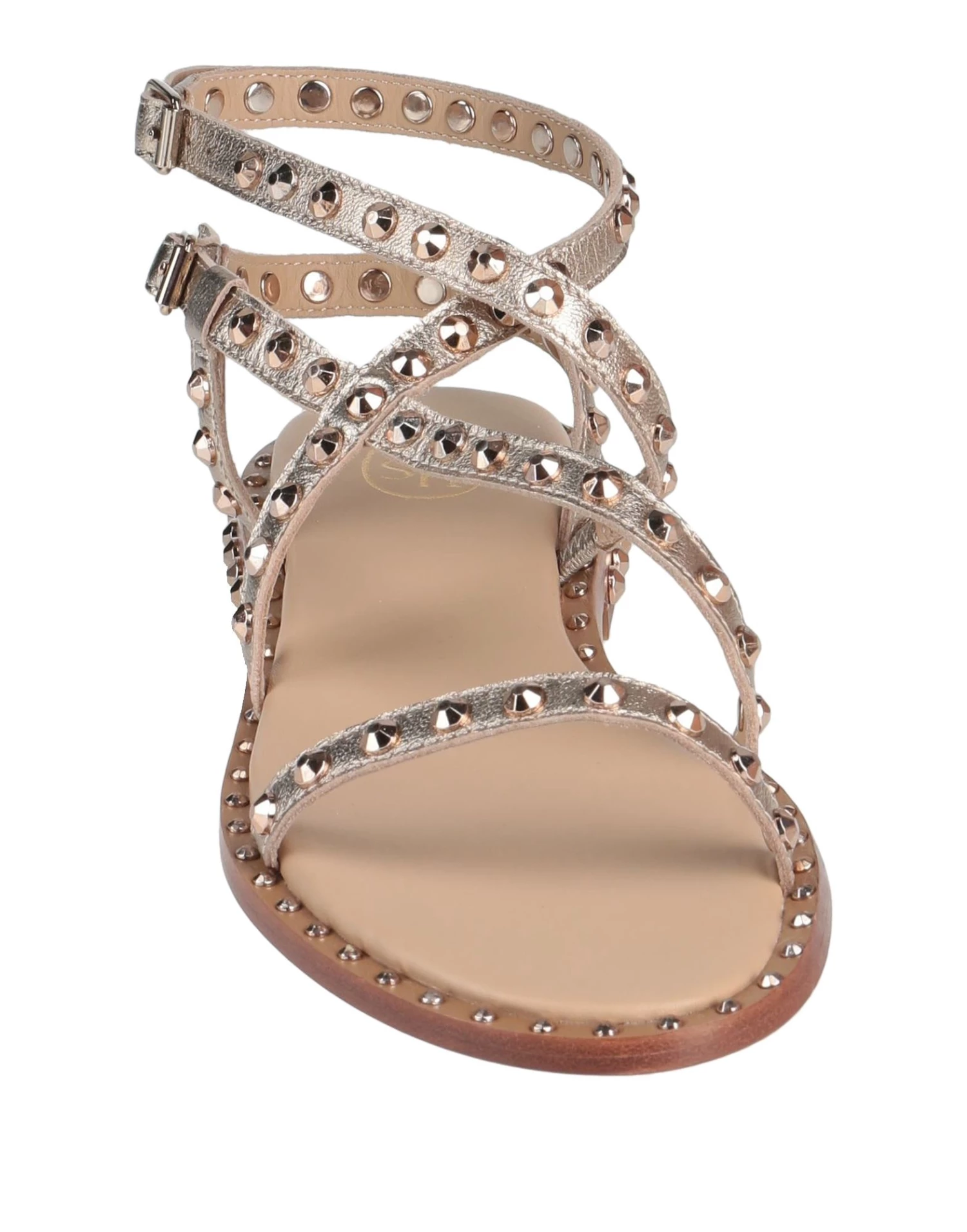 laminated effect, studs, solid colour with appliqués, leather backing, buckle fastening, flat, leather sole, contains non-textile parts of animal origin, round toeline